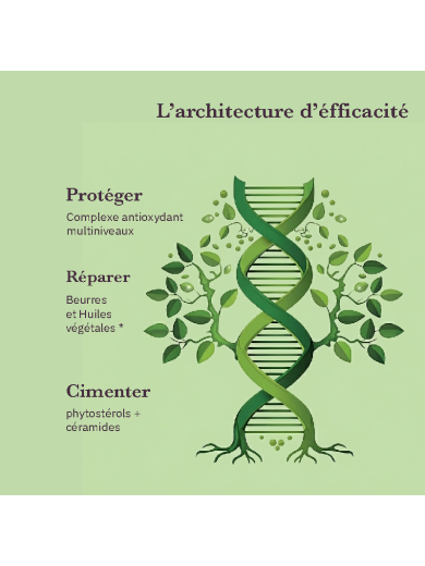 Aux côtés de cette structure réparatrice, un complexe antioxydant puissant (γ-oryzanol du son de riz, polyphénols de myrte, co-enzyme Q10, squalène) protège la peau du stress oxydatif, lié au teint terne et à la perte de fermeté, tandis que la barrière renforcée apaise les rougeurs d’inconfort.