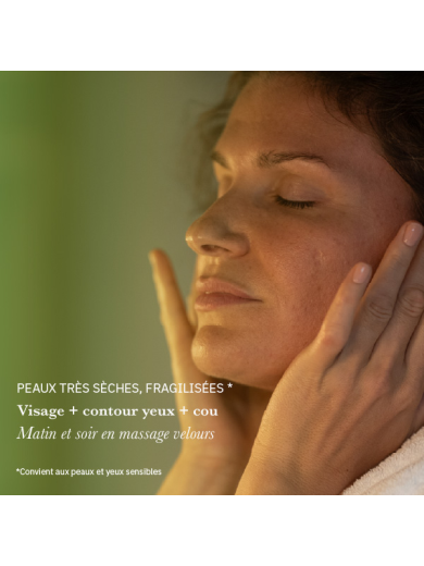 Peau très sèche, fragilisée ? Ce baume riche l’apaise, la répare et lui rend sa densité. Sa matrice lipidique biomimétique, riche en stérols végétaux,, fusionne avec la peau, comble les manques et réinstalle un confort profond, comme une doudoune moelleuse.