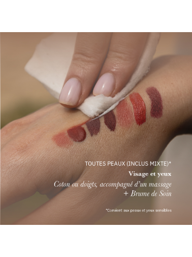 Le maquillage (visage et yeux, y compris les mascaras waterproof) se décroche par affinité lipidique, la peau reste enveloppée d’un voile confortable.